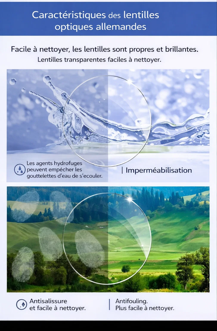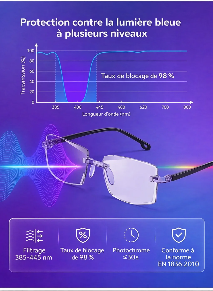 Protection Premium : Bloque 98% de la lumière bleue 🚫💙 + Verres intelligents auto-teintants (photochromiques) ☀️.